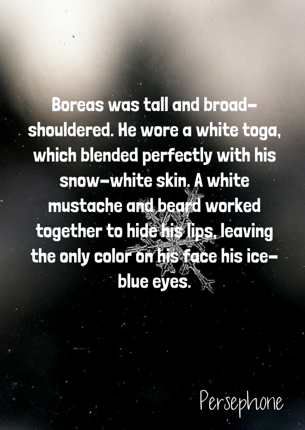 In appearance, Boreas is a cross between Old Man Winter and Jack Frost. Gods in my universe don’t age past their prime, so he’s younger than the traditional elderly yet oddly muscled old man with a long white beard. But he’s older than the youthful Jack Frost. So my character ended up with the short white hair Frost favors in most animations, the classic white beard, paper white skin, and muscles.